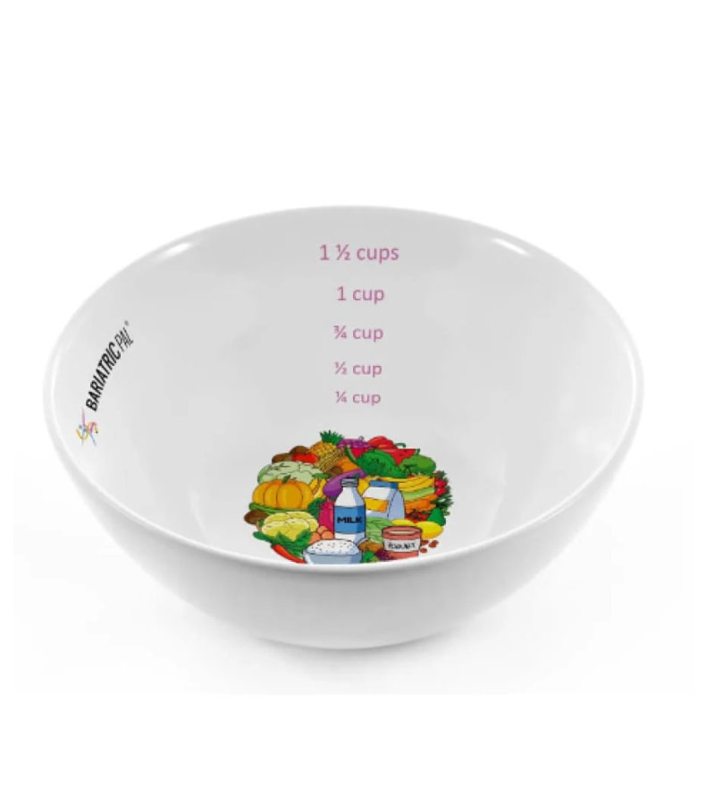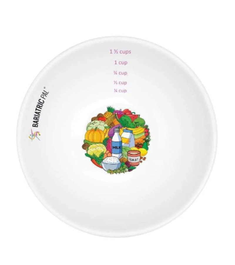 El Cuenco de Control de Porciones Bariátrico de BariatricPal está marcado en ¼, ½, ¾, 1 y 1 ½ tazas, por lo que solo tienes que agregar tu comida y comer sin pesar ni medir los alimentos previamente. Esto te ahorra tiempo y energía, y hace que el control de porciones sea muy sencillo. El cuenco tiene un diseño atractivo con imágenes de alimentos nutritivos y coloridos, y el conocido logo de BariatricPal en el interior, recordándote que estamos apoyando tu éxito en la pérdida de peso.